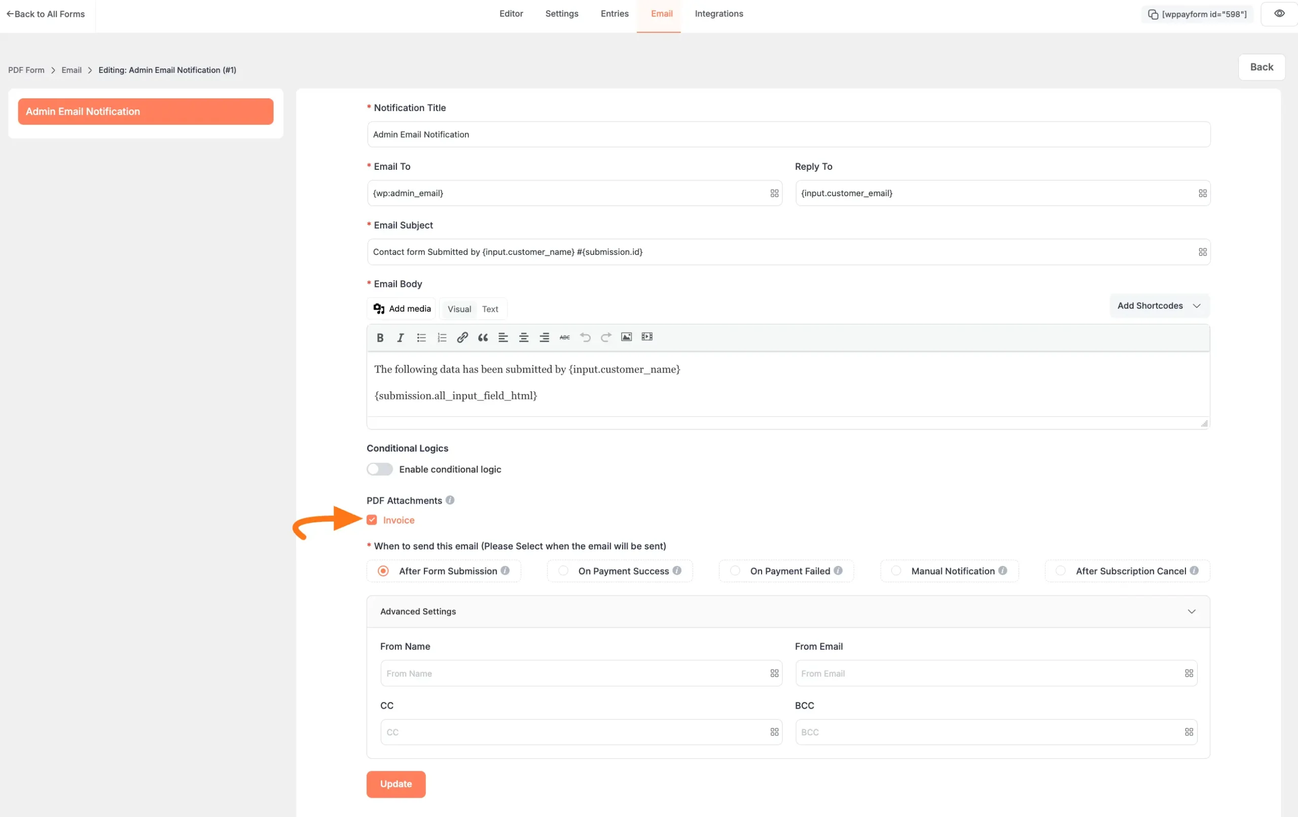 And, your PDF Feed will be added to the Admin Email Notification. Now, whenever a user submits the form this PDF Feed will be sent to the Admin Email.