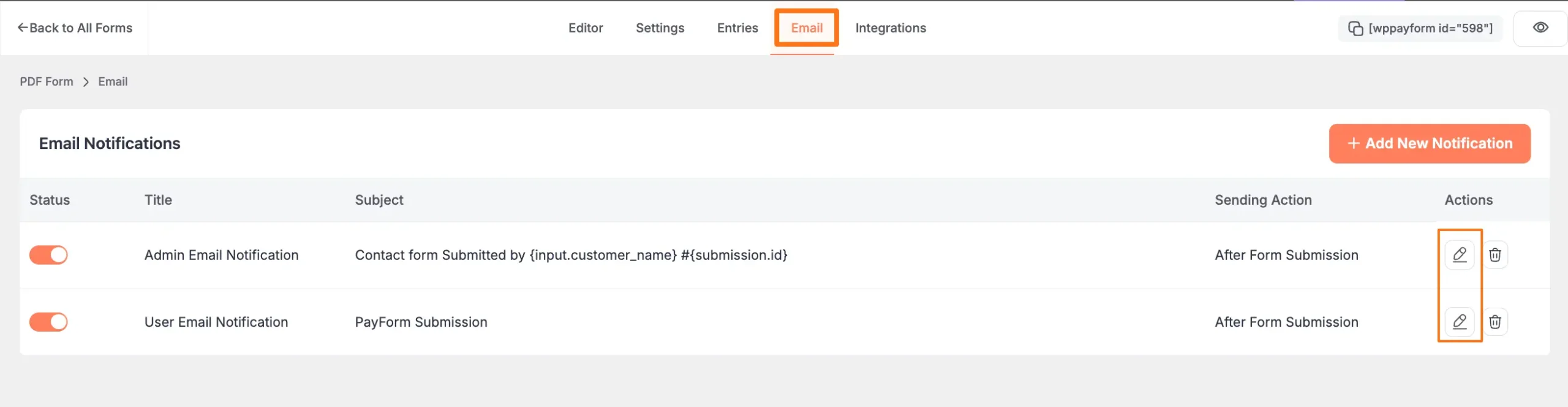 To send the previously added PDF Feed through Emails to the Admin or the User, go to the Email section of the chosen form and click on the Pencil Icon button.