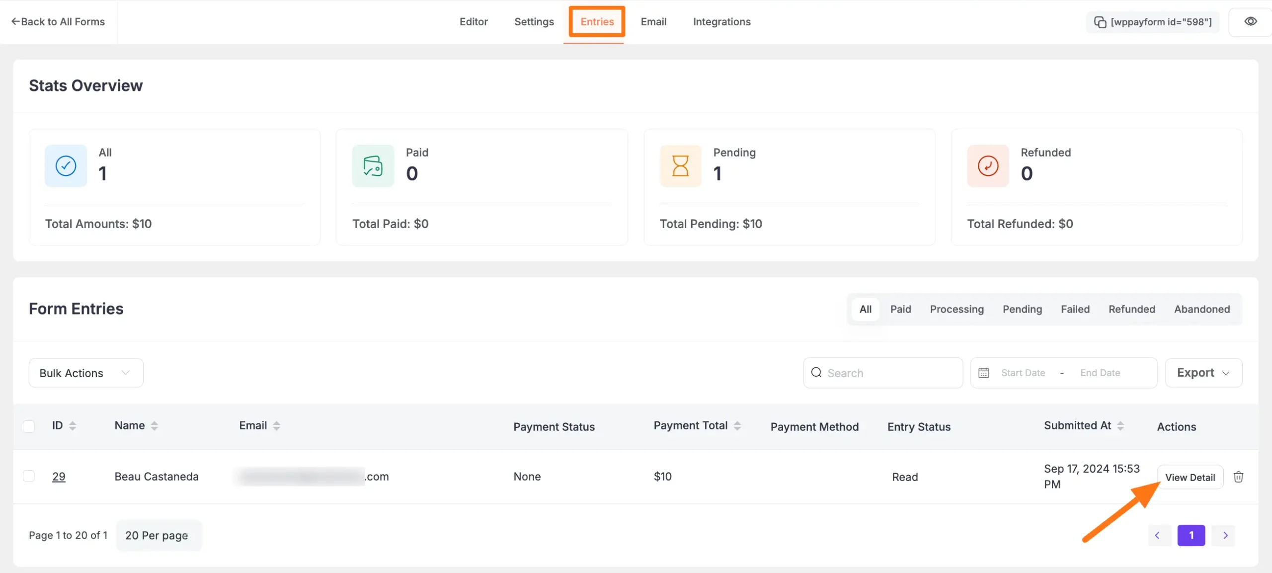 Once you have done customization and added the PDF Feed, go to the Entries section of the chosen form. Now, select any submission entry you wish to work on and click the View Details button of that entry.