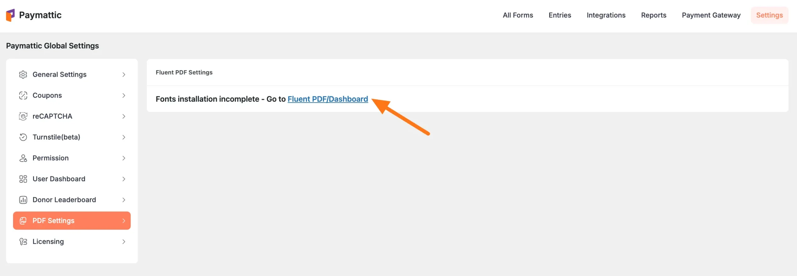 Once you install and activate Fluent PDF, return to the Settings from the Paymattic Navbar, open the PDF Settings tab from the left sidebar, and the PDF Settings page will appear.