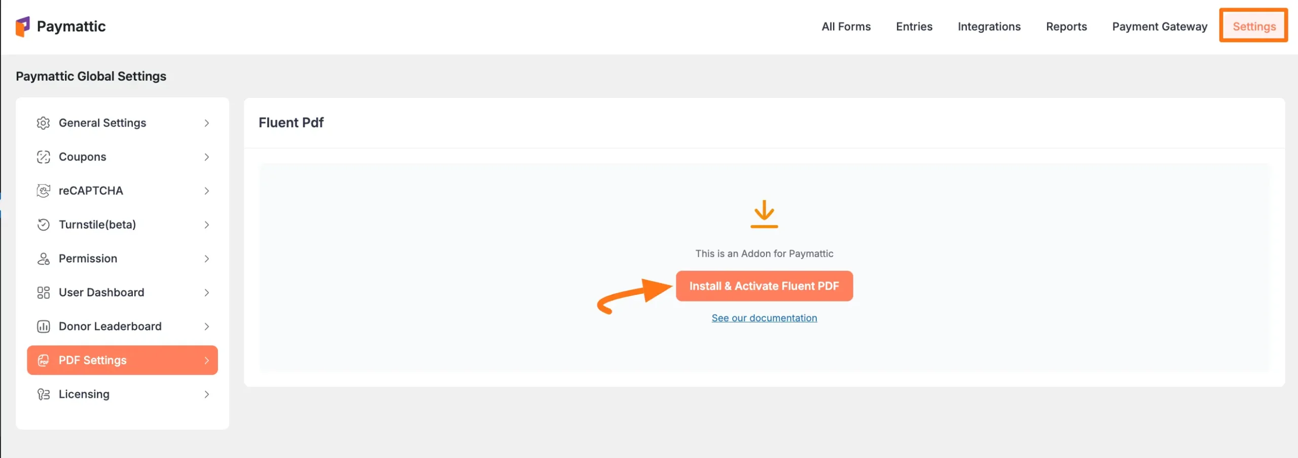 To Activate the PDF Feed in Paymattic you need to Install & Activate the Fluent PDF add-on.