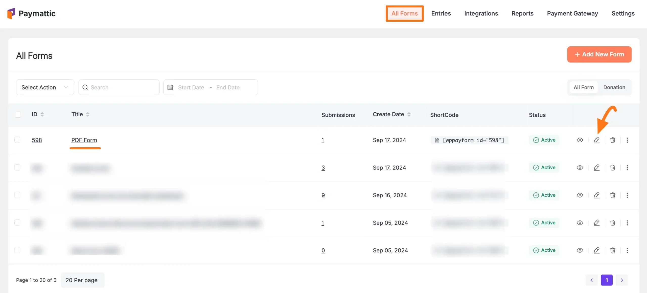 First, go to All Forms from the Paymattic Navbar, choose any existing Form you wish to work on, and click the Pencil/Editor icon.