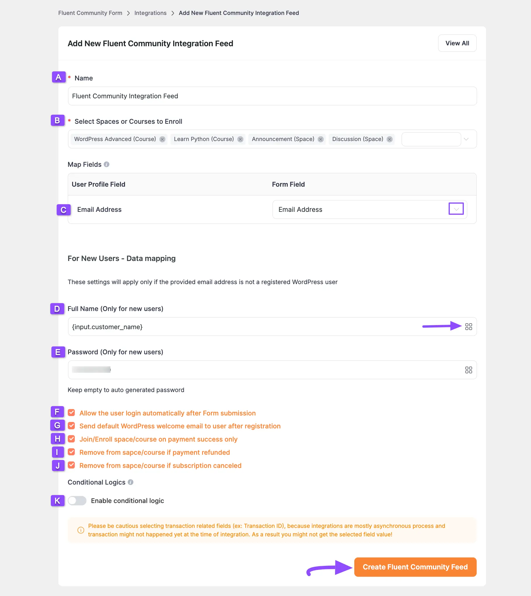 Once you set up the page, click the Create FluentCommunity Feed button and the feed will be integrated into this specific form.