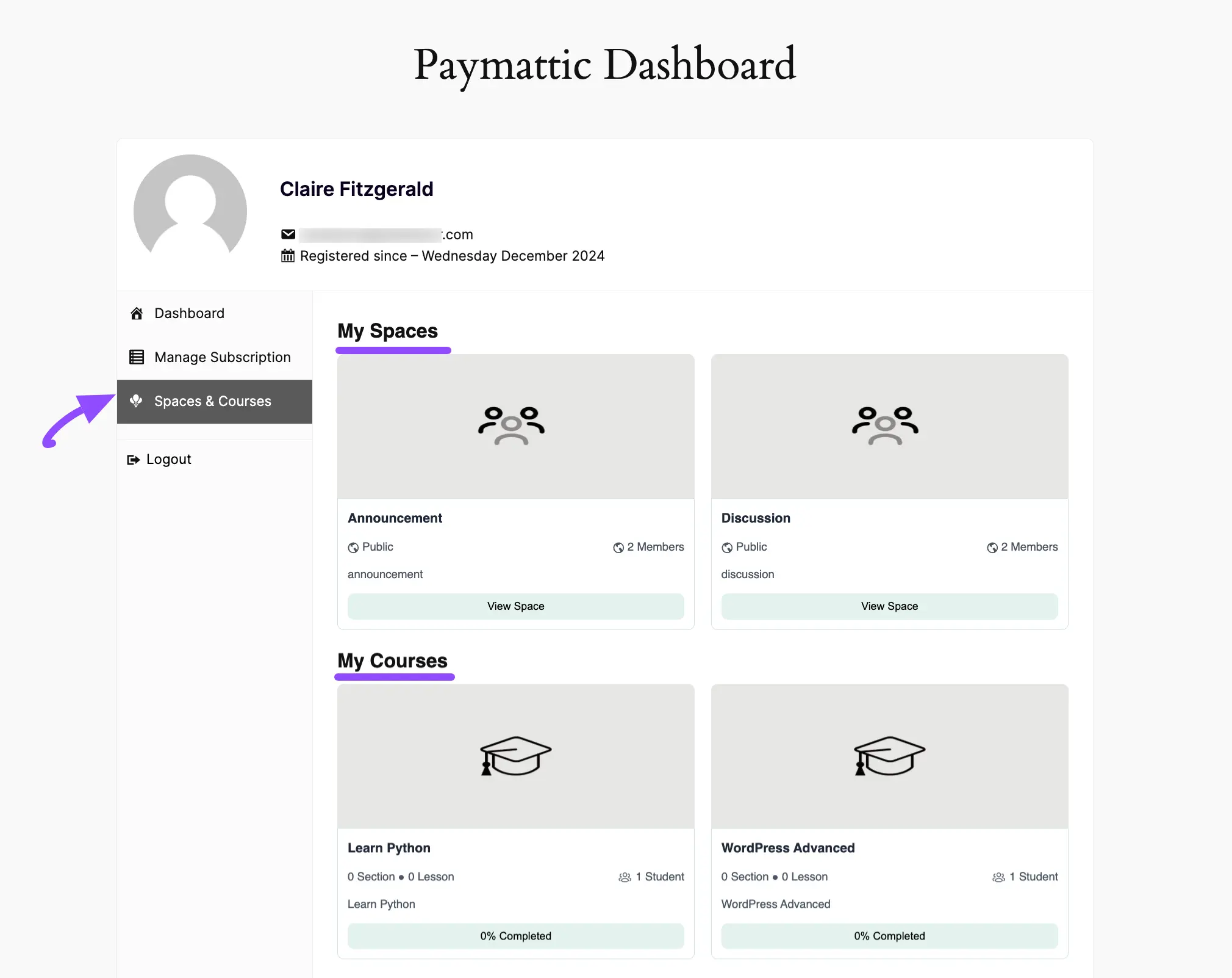 After completing the integration, Paymattic users or FluentCommunity members who access the Community through Paymattic will see a dedicated section called "Spaces & Courses" in their User Dashboard.