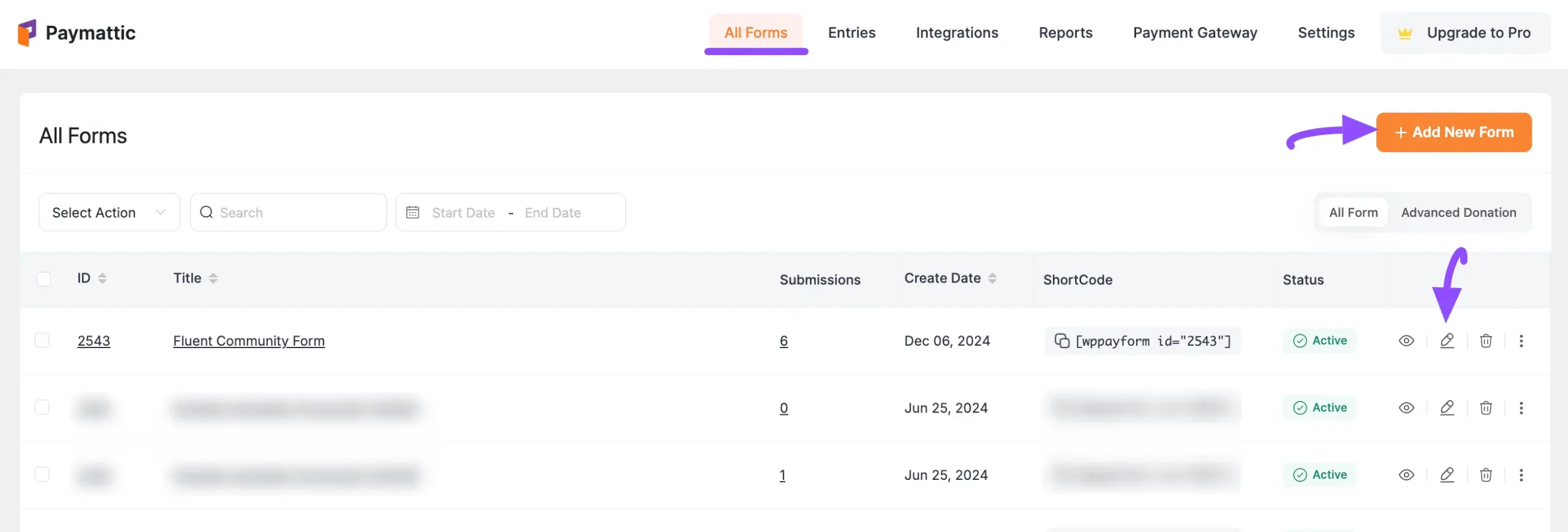 First, go to All Forms from the Paymattic Navbar, select the Desired Form where you want to integrate FluentCRM and click the Pencil/Editor Icon.