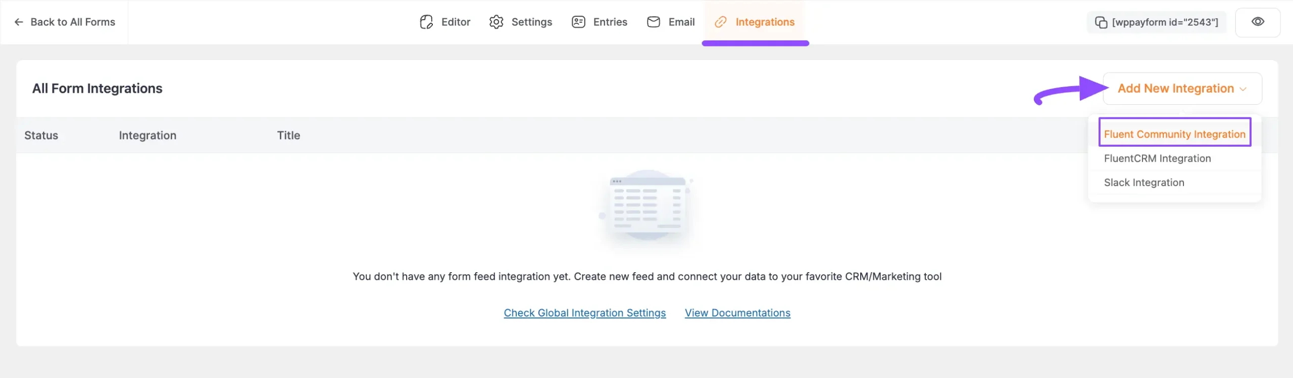 Once you are on the Editor page of your desired form, go to the Integrations tab, open the Add New Integration dropdown list, and select the FluentCommunity Integration option.