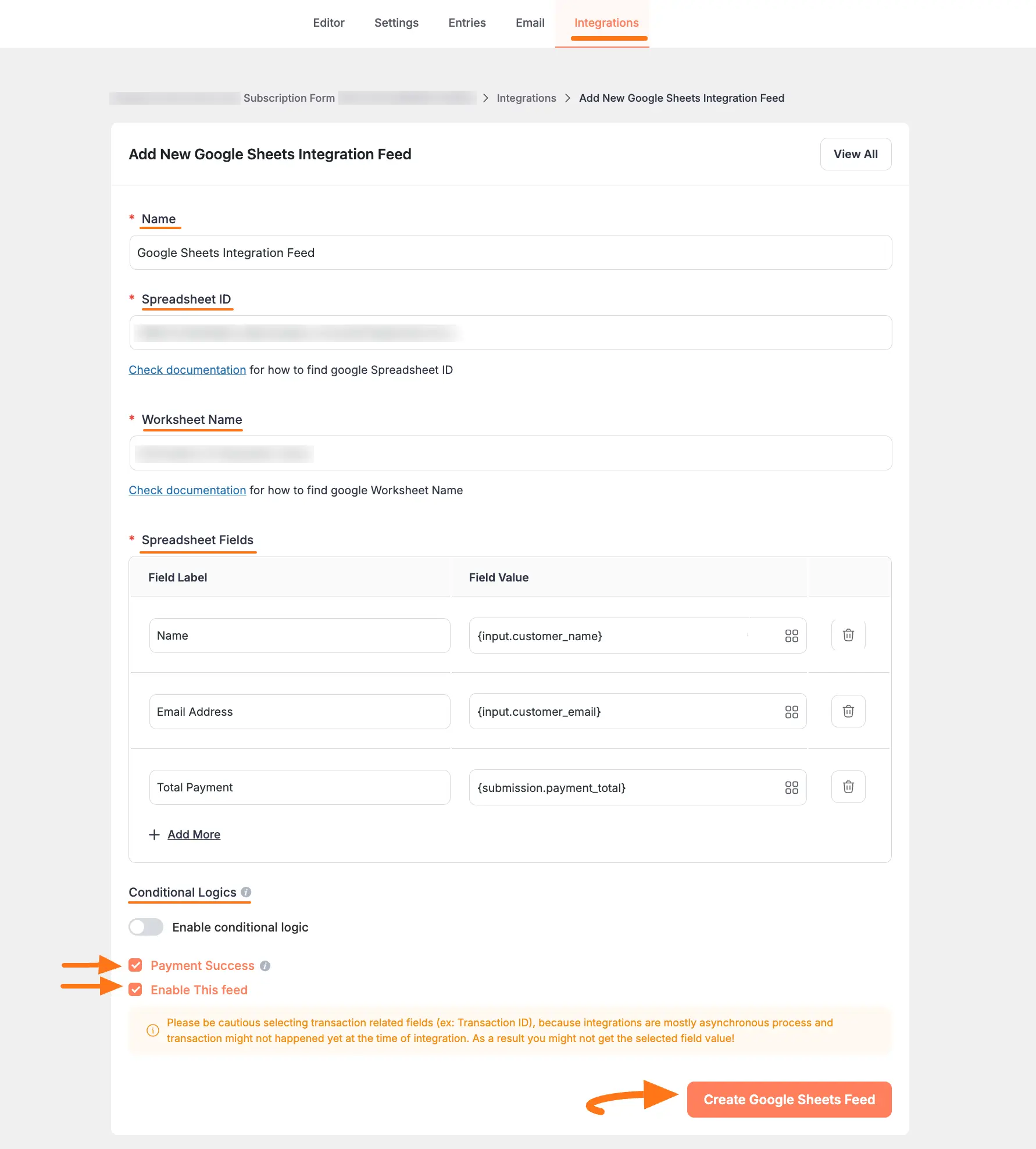 Once you copy the Spreadsheet ID and Worksheet Name, return to the Add New Google Sheets Integration Feed page from the Form’s Integration tab.