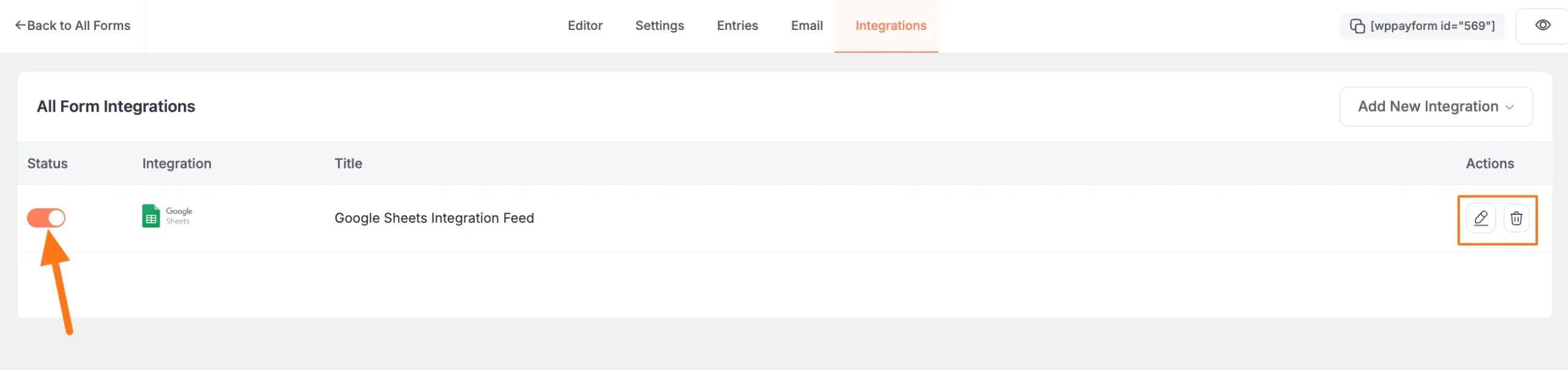 First, go to All Forms from the Paymattic Navbar, select the Desired Form where you want to integrate the Google Sheets, and click the Pencil/Editor Icon.