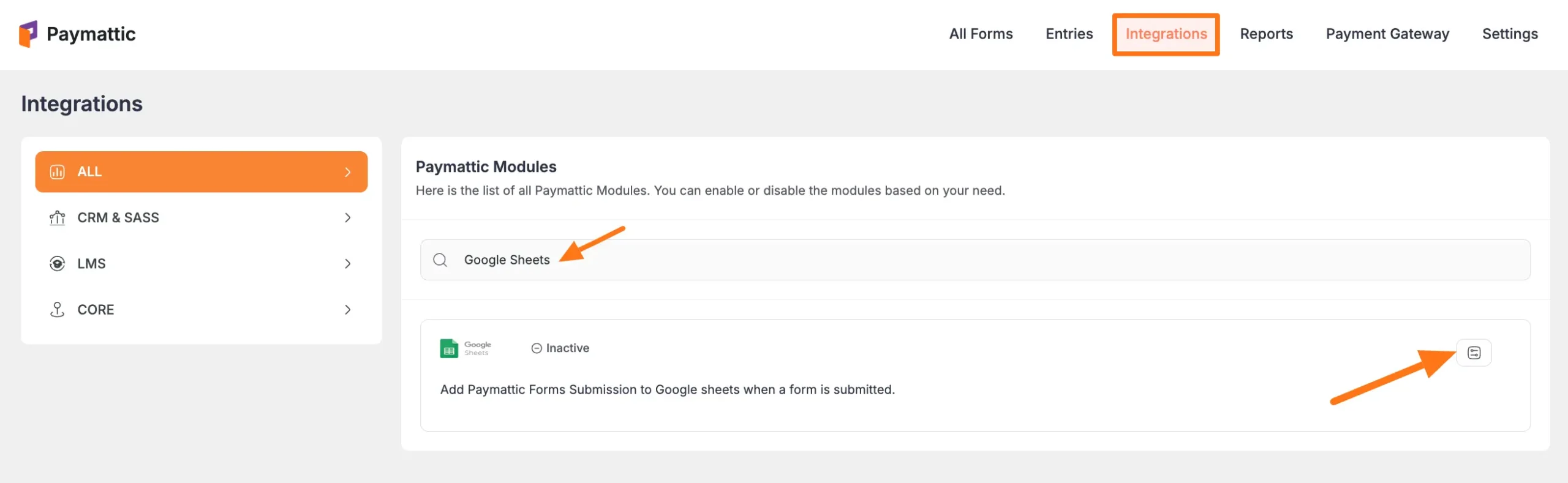 First, go to Integrations from the Paymattic Navbar, search for the Google Sheet through the search bar, and you will get the Google Sheets integration module.