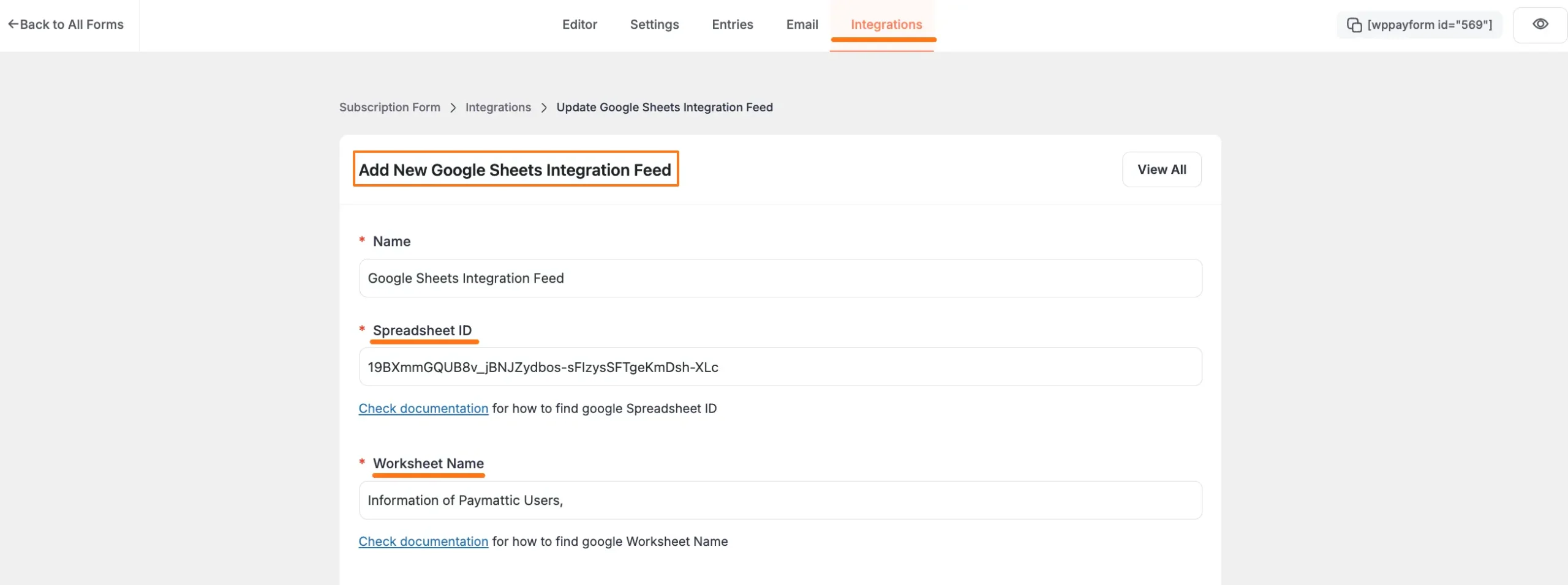 To function Google Sheets integration with Form properly, you must provide the Spreadsheet ID and Worksheet Name of your Google Sheets Account and set up the Spreadsheet Fields.