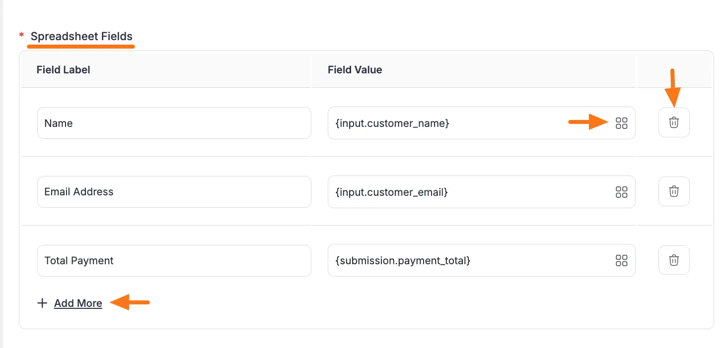 You can add as many fields as you need by clicking the + Add More button. Also, can delete any field by clicking the Trash Icon if needed.