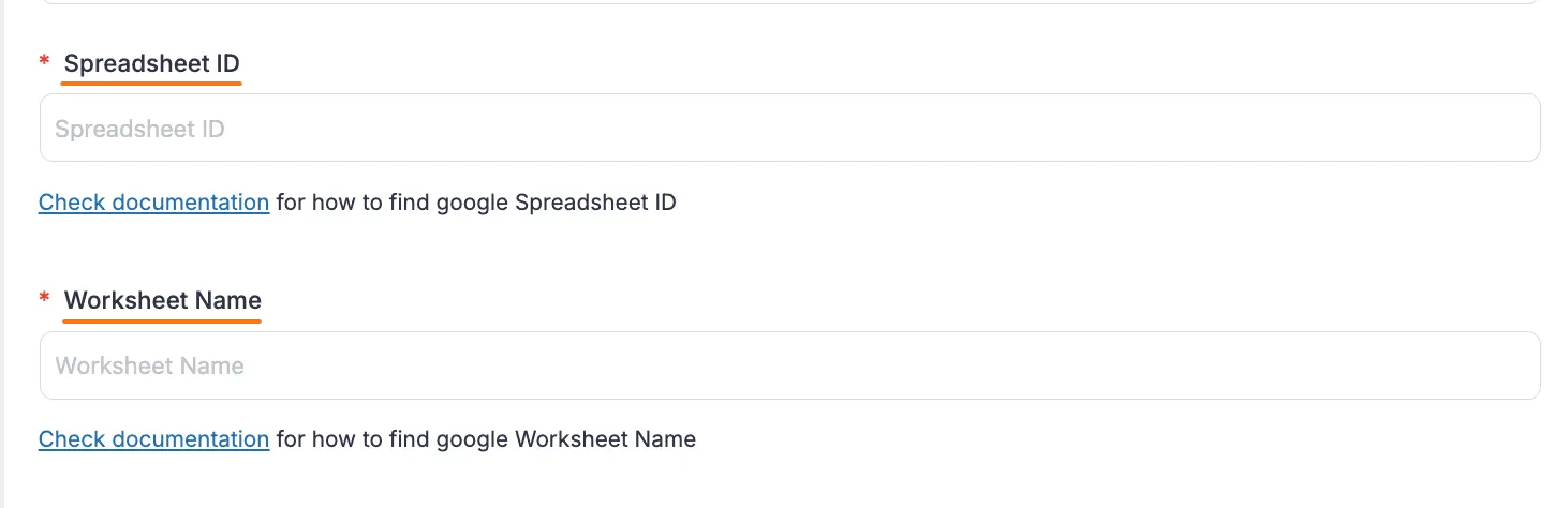 Here, you need to provide the Spreadsheet ID and Worksheet Name of your Google Sheets Account that you want to integrate with the form as it's required to be filled in.