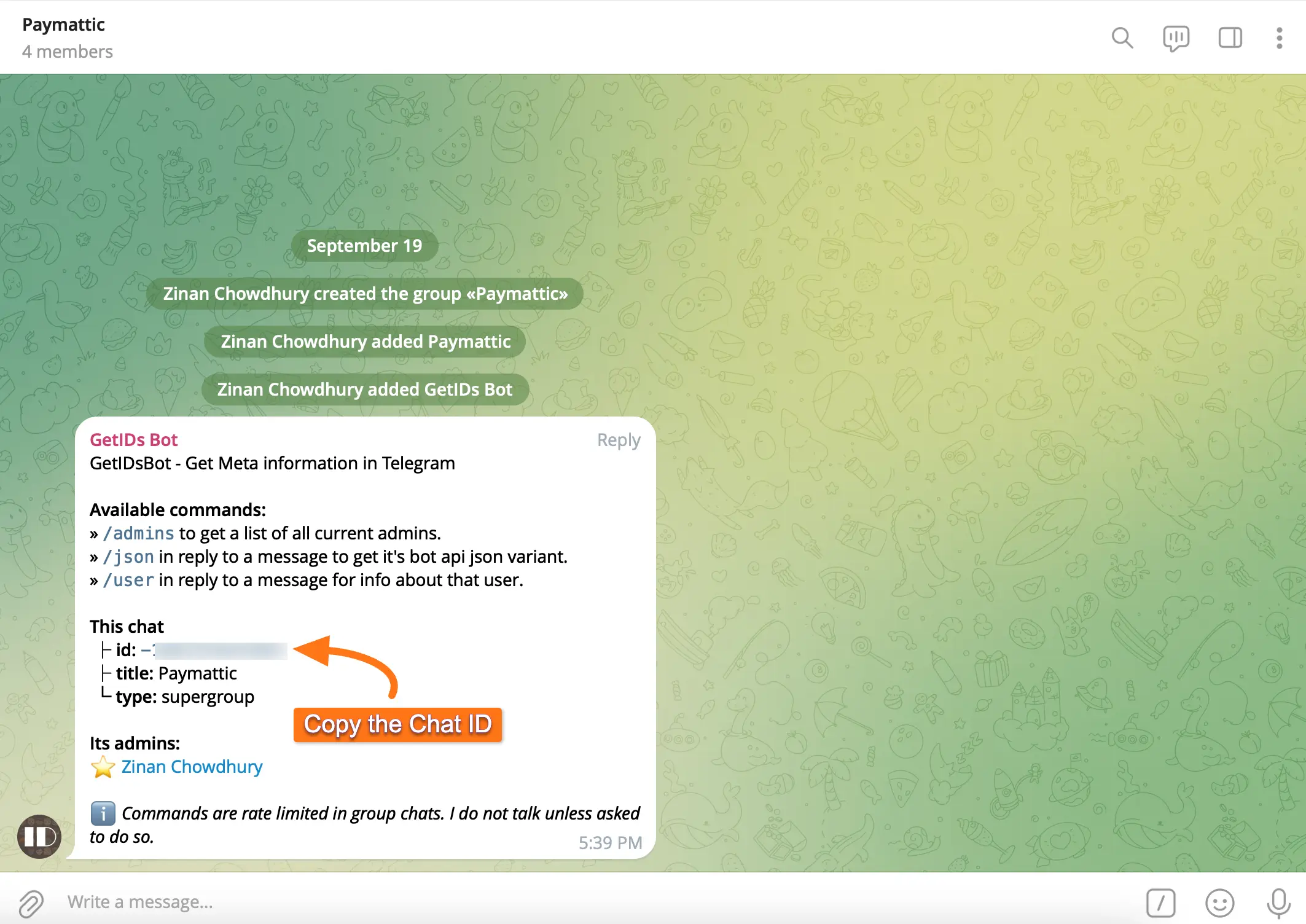 After adding the GetIDs Bot as a member, it will send a message to the group with the Group Chat ID. Simply, copy it.