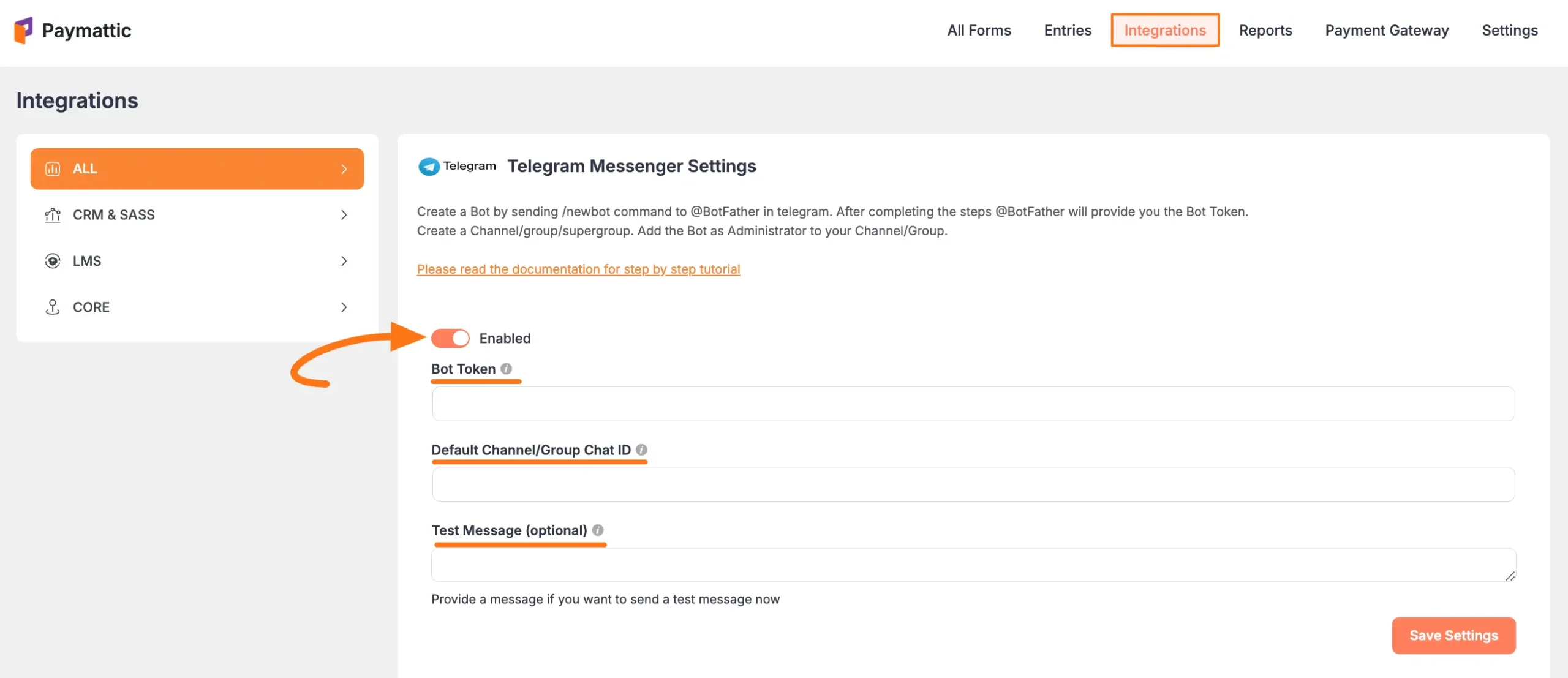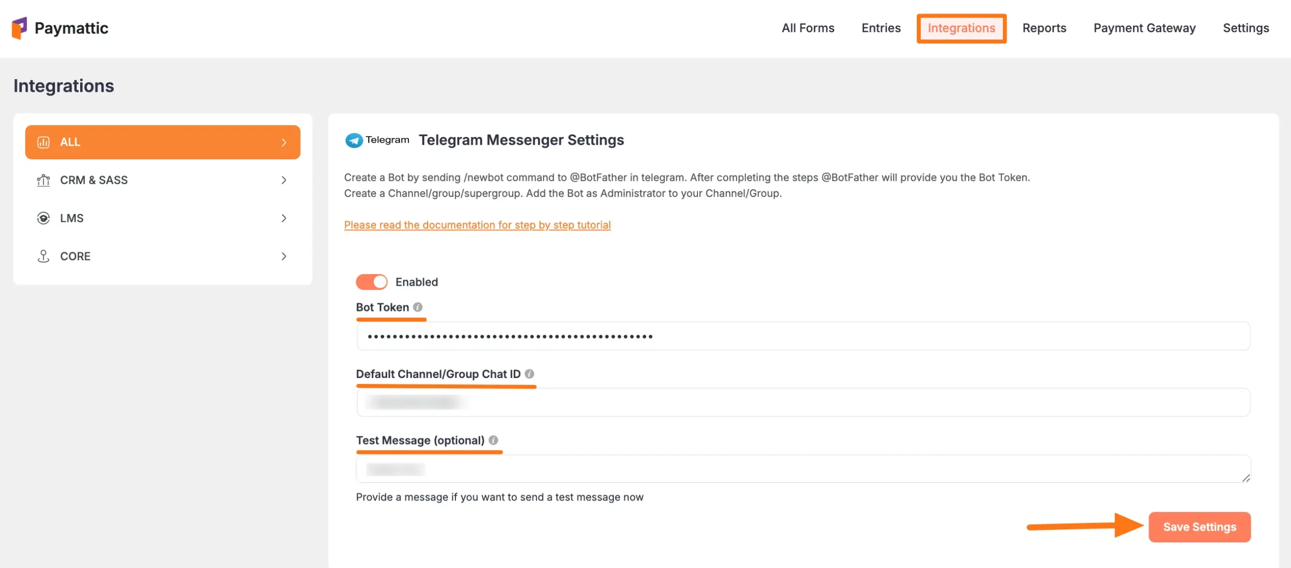 Now, return to the Telegram Messenger Settings page under the Integrations section from the Paymattic Navbar.
