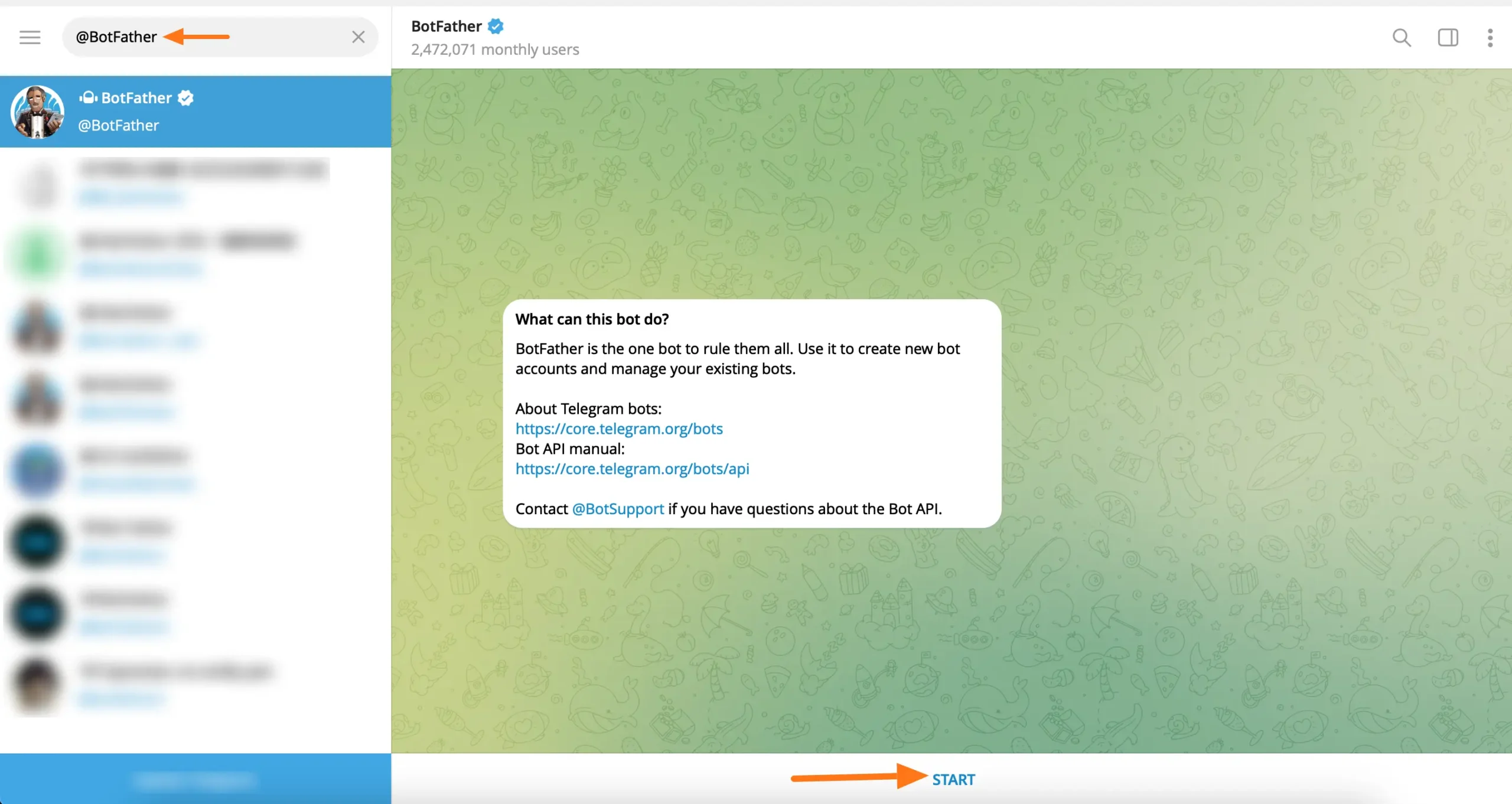 First, log in to your Telegram Account and send a text to @BotFather or click the Start button to start the bot in your Telegram application.