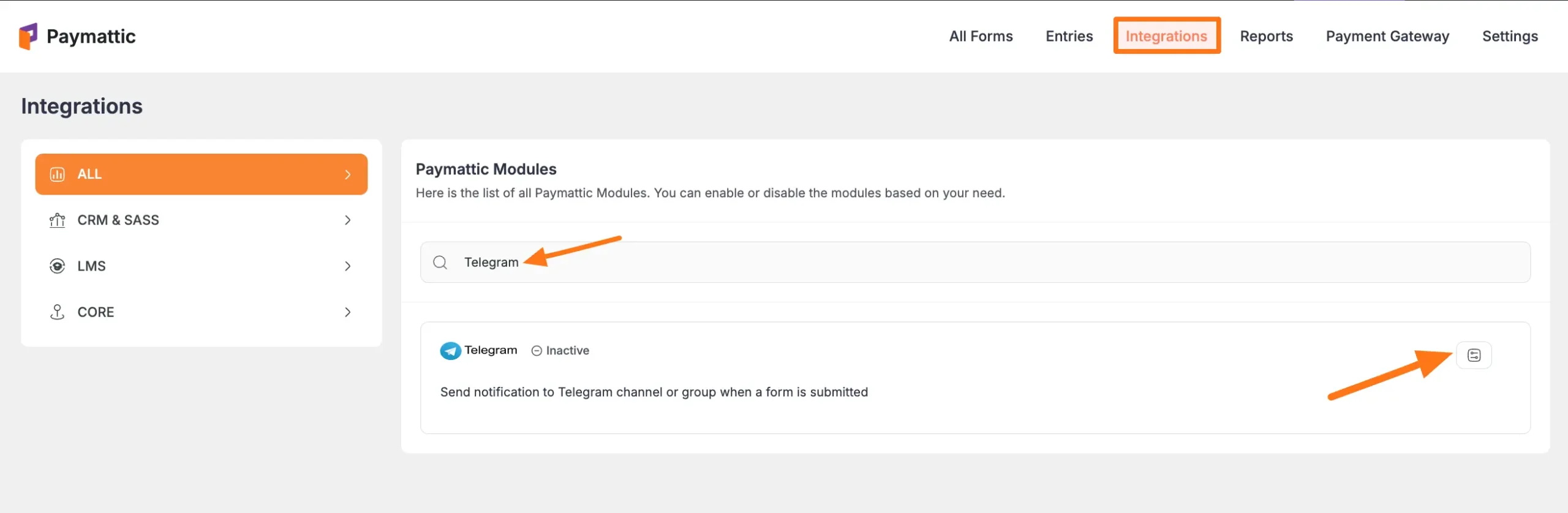 First, go to Integrations from the Paymattic Navbar, search for Telegram through the search bar, and you will get the Telegram integration module.
