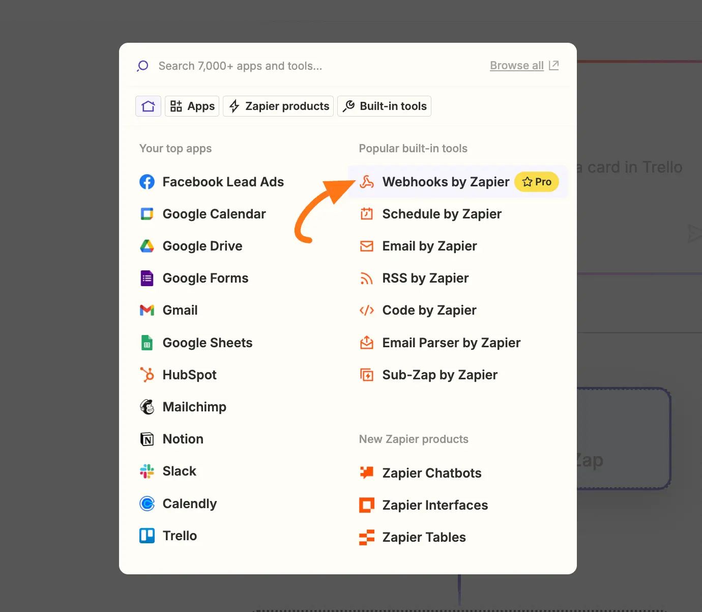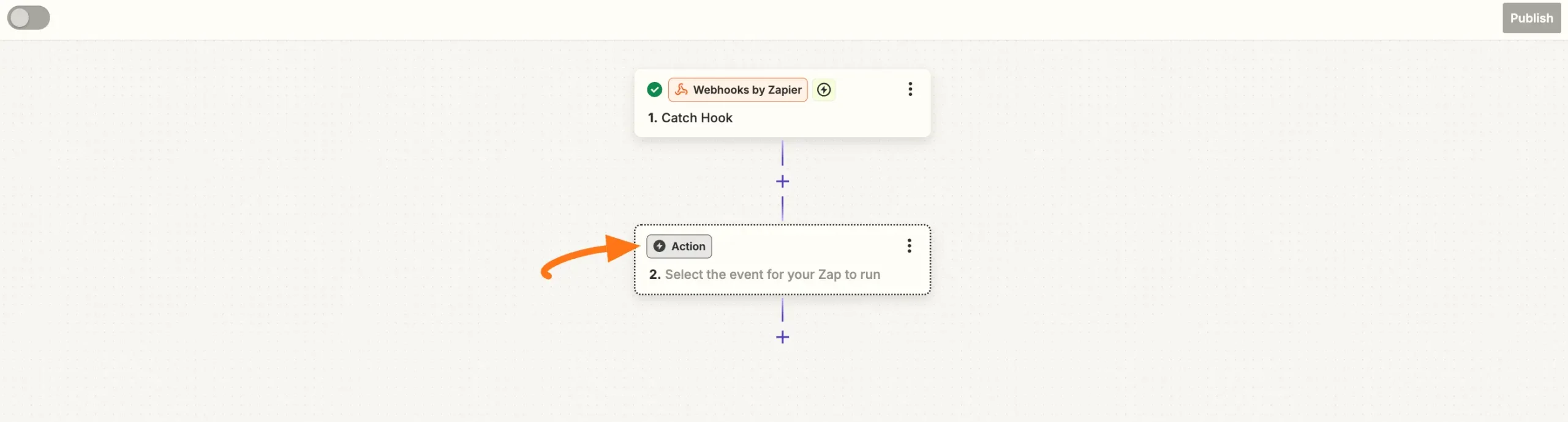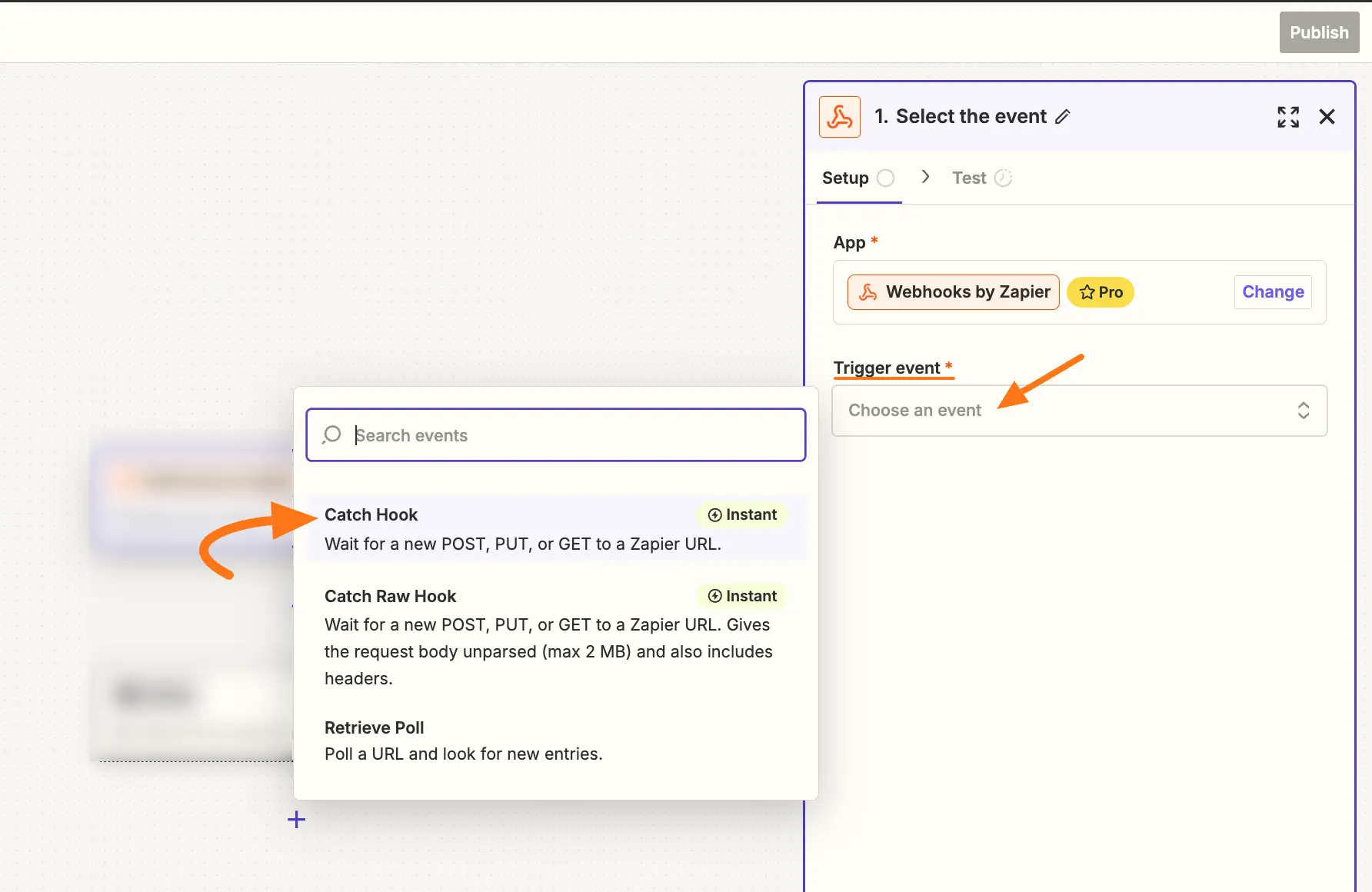 Click the Choose an event field and a pop-up will appear to select your Trigger event. Select Catch Hook as a trigger event.
