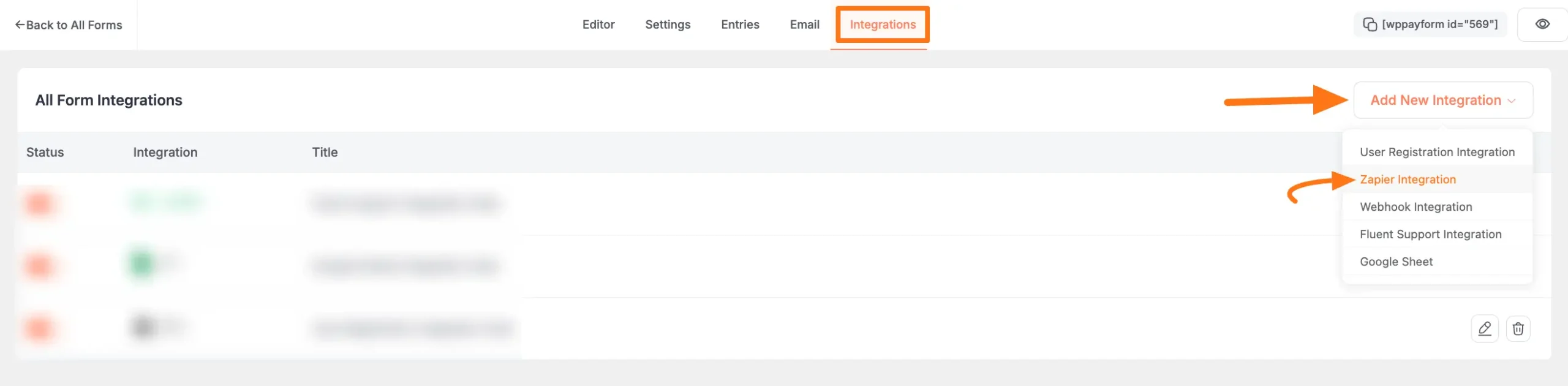 Once the Editor page opens, go to the Integrations tab, click the Add New Integration button & select Zapier Integration feed from the dropdown list.