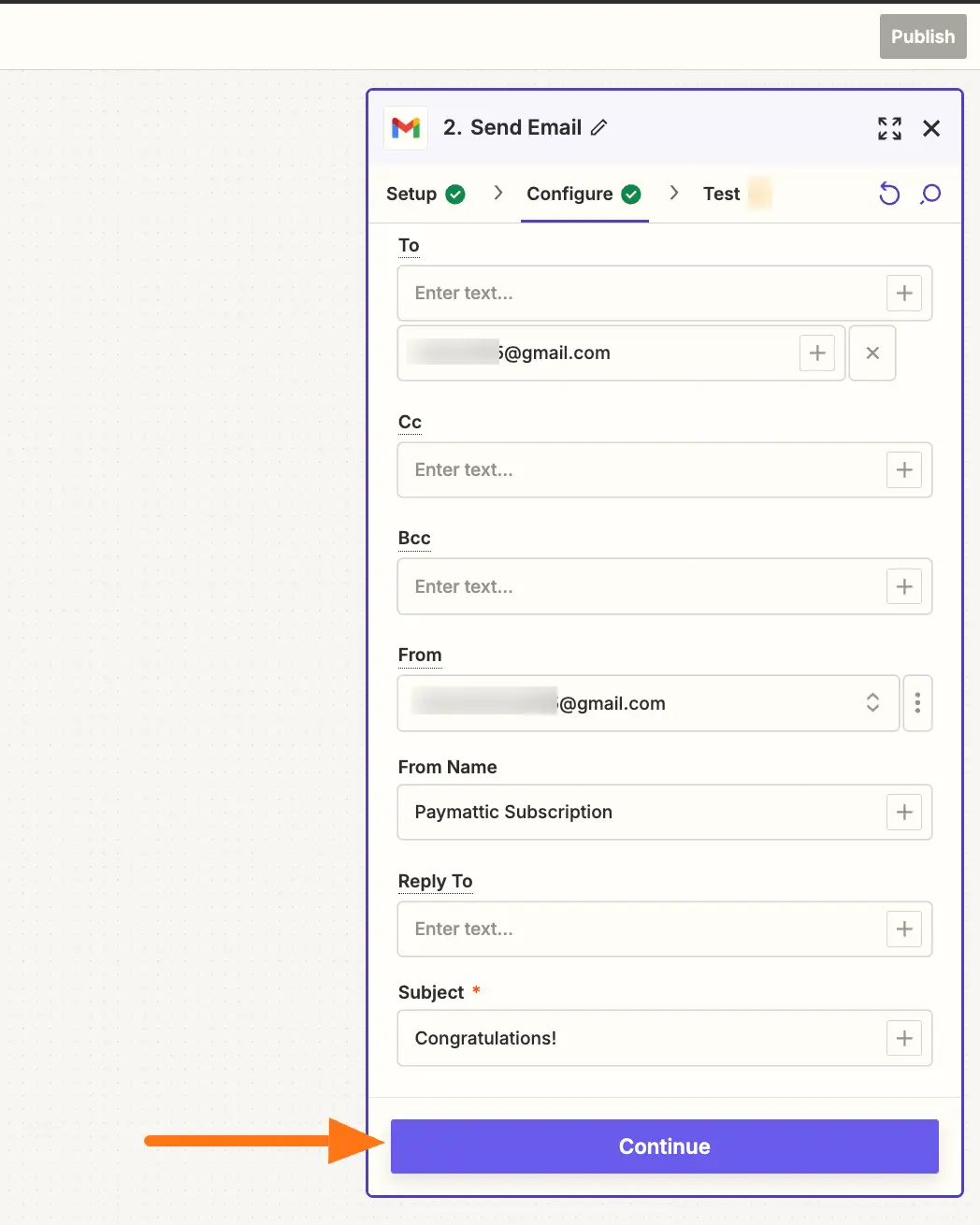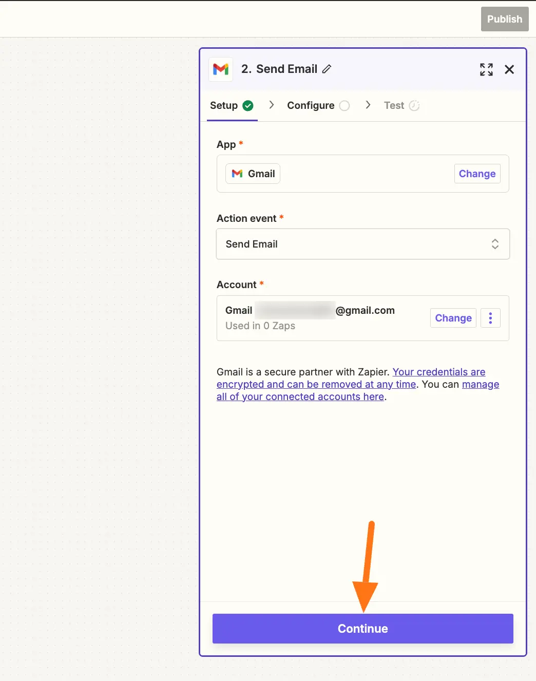 Once you connect the Gmail account from which the email will be sent, click the Continue button for next steps.