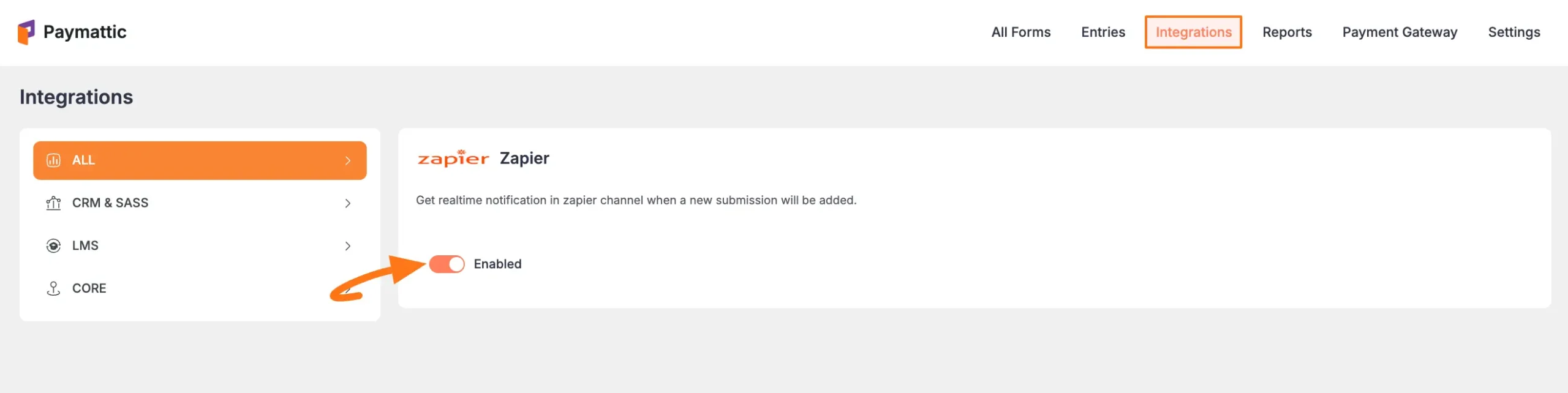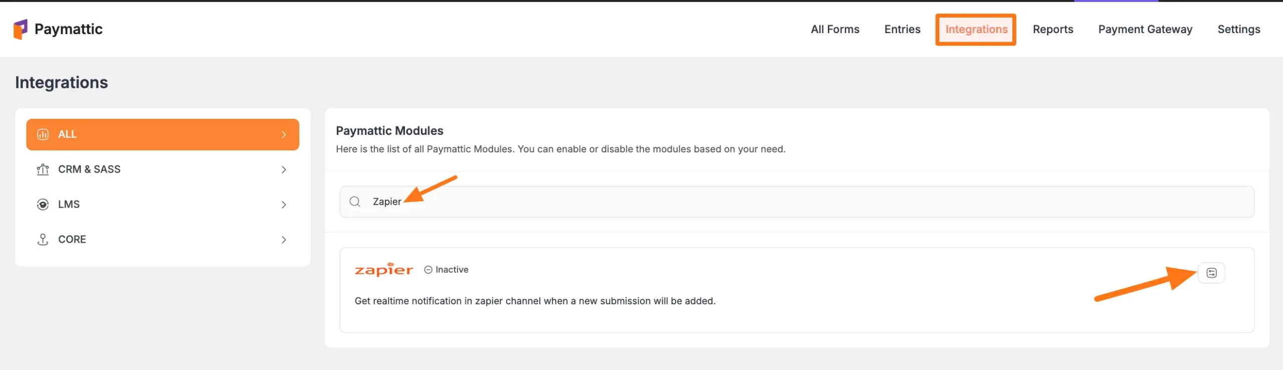 First, go to Integrations from the Paymattic Navbar, search for Zapier through the search bar, and you will get the Zapier integration module.