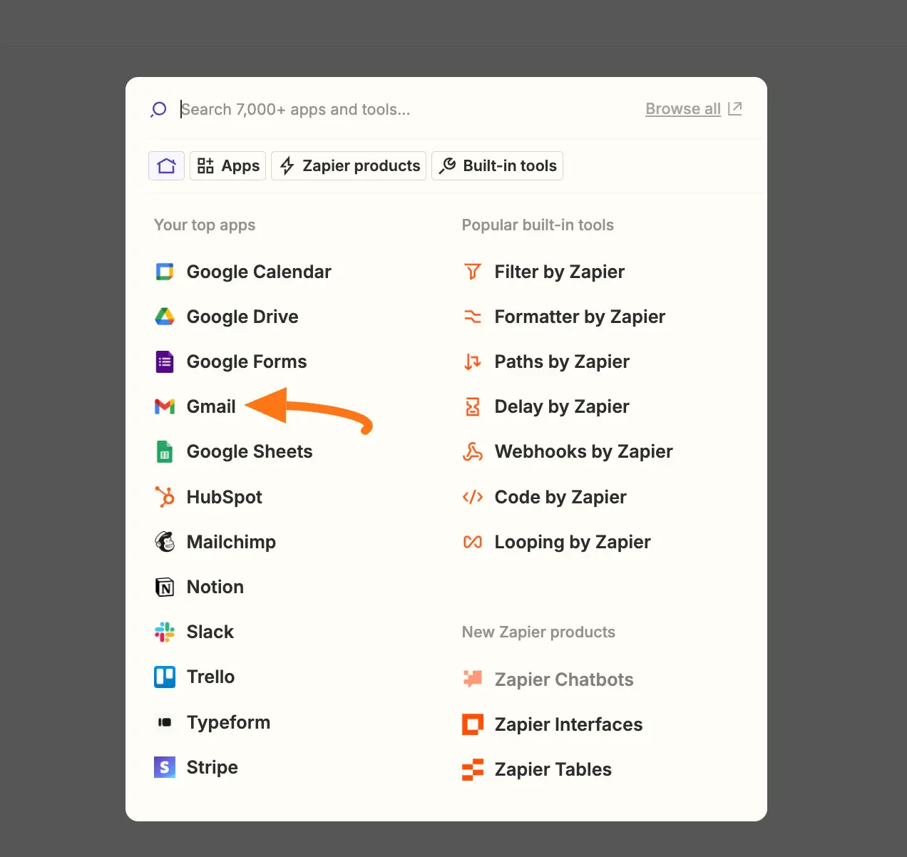 Select an App through which you want to run the action. For example, I am selecting Gmail for demonstration purposes.