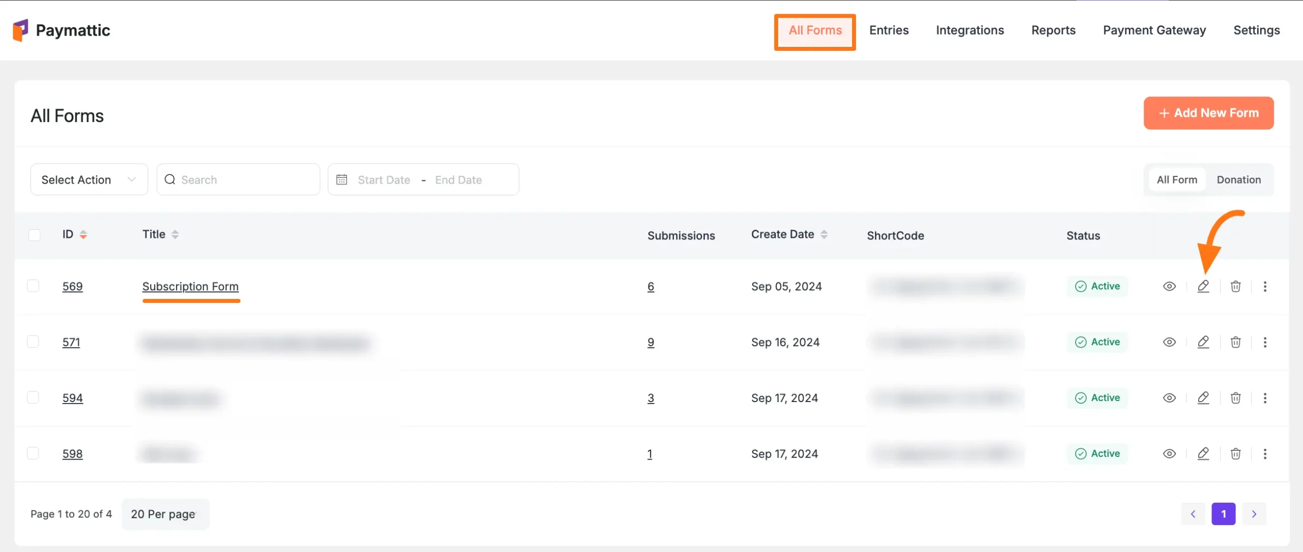 First, go to All Forms from the Paymattic Navbar, select the Desired Form where you want to integrate Zapier, and click the Pencil/Editor Icon.