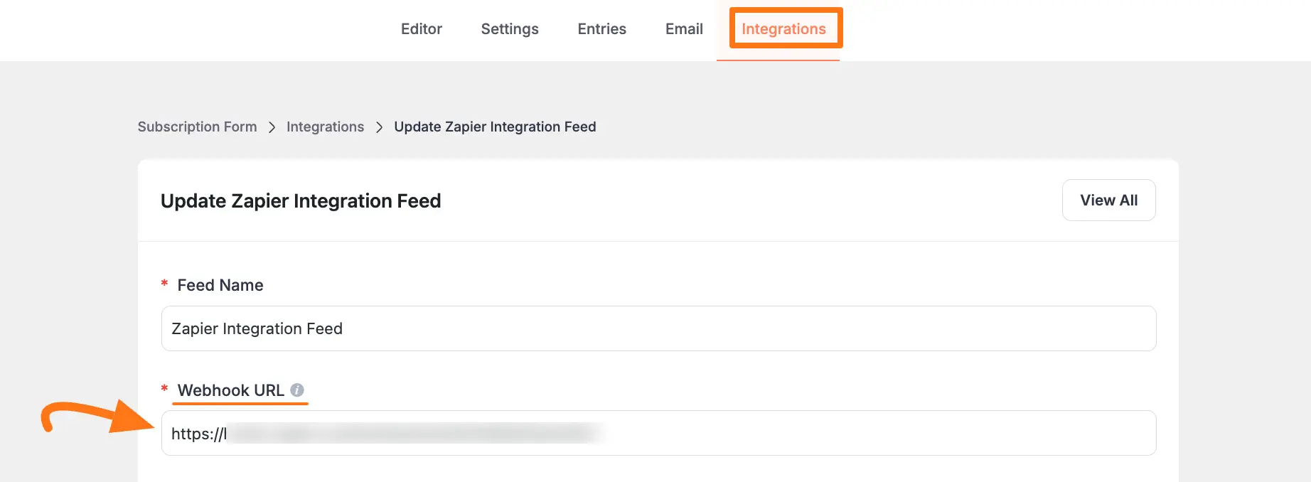 Now return to the Add New Zapier Integration Feed page from the Form’s Integration tab. And, paste the URL you copied from Zapier into the Webhook URL field.
